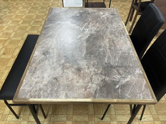 *アカシア無垢画材と石目の天板とスチールとレザーの組み合わせがシンプルでモダンな雰囲気のダイニングセットです。